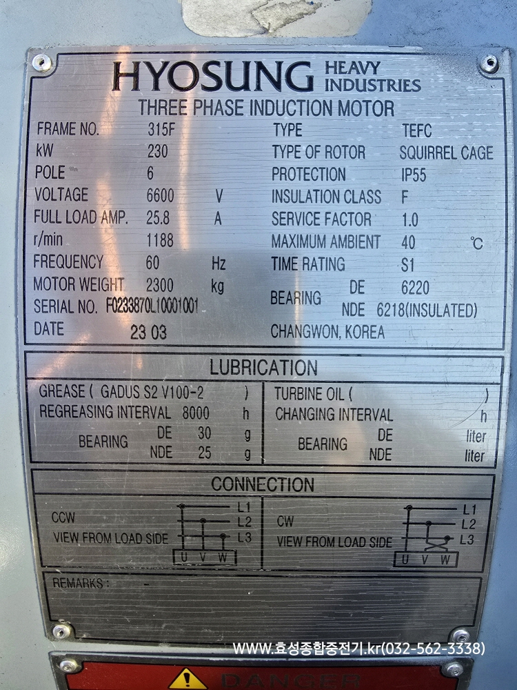 효성 고압모터 230KW*6P*60HZ*6600V 신품 보유 중입니다.